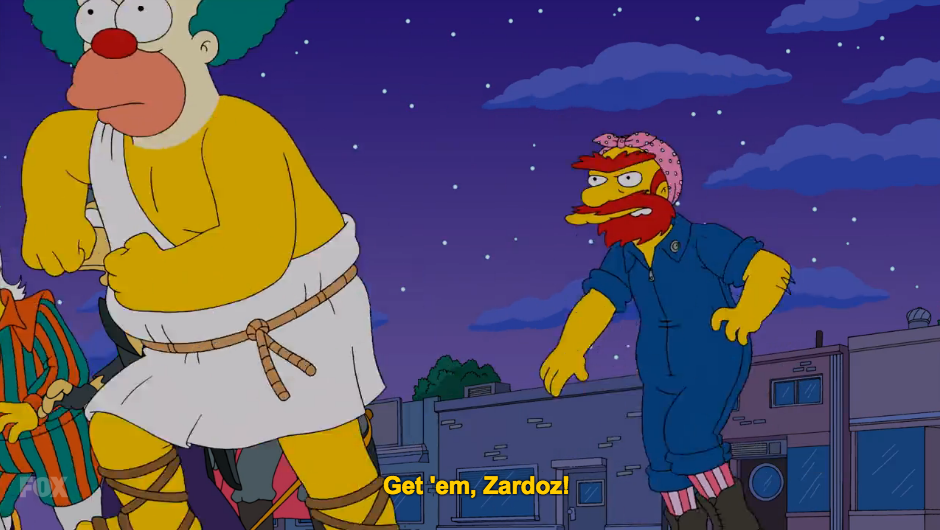 "NC-17 Halloween" isn't quite nightmare fuel like an episode of HBO's Real Sex, but it's almost there. It also leads to the episode's most amusing costume: Superintendent Chalmers in Sean Connery's diaper from Zardoz, which is up there with Bart as a Droog in "Treehouse of Horror III." Coming in a close second and third are Agnes Skinner as Amy Winehouse and a fully recovered Lisa as Zombie Frida Kahlo at the end of the episode.